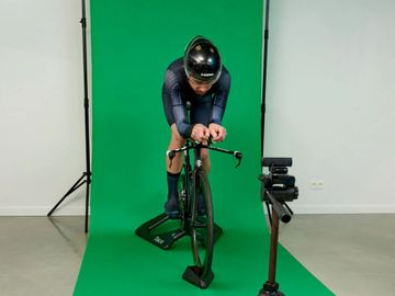 In the absence of testing data from a wind tunnel, fluid dynamics or velodrome test we employ the Bioracer Virtual Wind Tunnel green screen to provide live feedback on front area of a given aerodynamic posture. Bioracer Aero system is able to cut out out the rider on a green screen with a view to measuring the biggest component in the coefficient of drag acting on a rider, the A in CdA, or size of the frontal area.